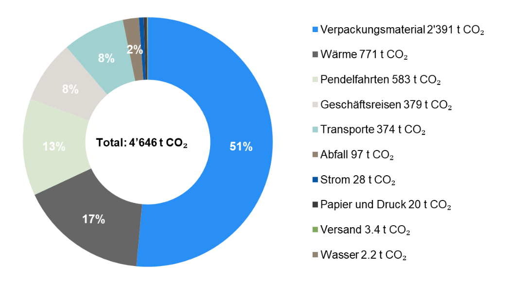 Für das Bilanzjahr 2024 belaufen sich die bilanzierten Emissionen auf 4'646 t CO21. Die grössten Emissionsquellen sind dabei die Verpackungsmaterialien, die Kategorie Wärme und die Pendelfahrten. Diese machen gemeinsam 72 Prozent der Bilanz aus.