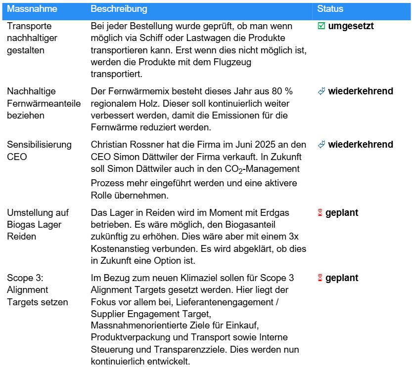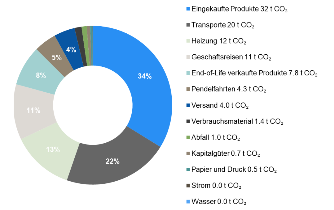 Für das Bilanzjahr 2024 belaufen sich die bilanzierten Emissionen auf 95 t CO2. Die grössten Emissionsquellen sind dabei Eingekaufte Produkte, Transporte sowie die Heizung. Diese machen gemeinsam rund 69 % der Bilanz aus.