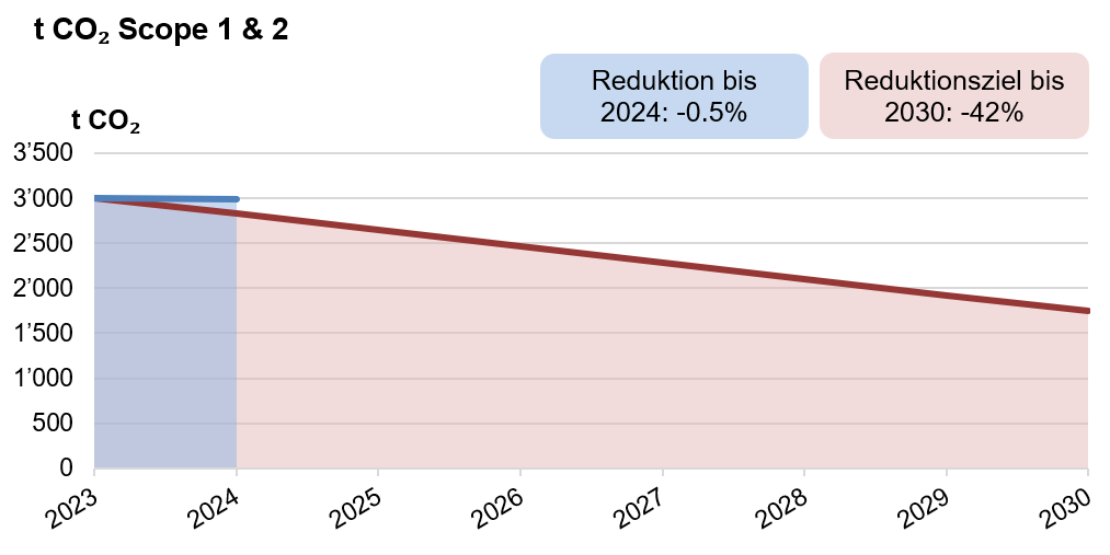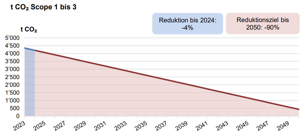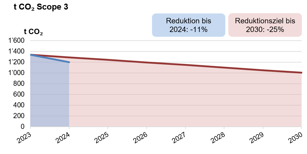 In der Bilanz nicht enthaltene Emissionen entlang der Wertschöpfungskette wurden mit zusätzlichen Berechnungen und im Rahmen eines Screenings in der Höhe von 288 t CO2 identifiziert. Dabei handelt es sich um Emissionen im Rahmen der Instandhaltung der Fahrzeuge (123 t CO2) und Emissionen aus neu angeschafften Fahrzeugen (165 t CO2). Da die beiden Kategorien zusammen weniger als 6 % der Gesamtemissionen ausmachen, wurden sie aus der Bilanz 2023 und 2024 ausgeschlossen. Zukünftig wird im Rahmen eines Screenings periodisch eruiert, ob es mengenmässig zu erheblichen Zunahmen gekommen ist, was ein nachträglicher Einschluss in die Bilanzierung zur Folge hätte.