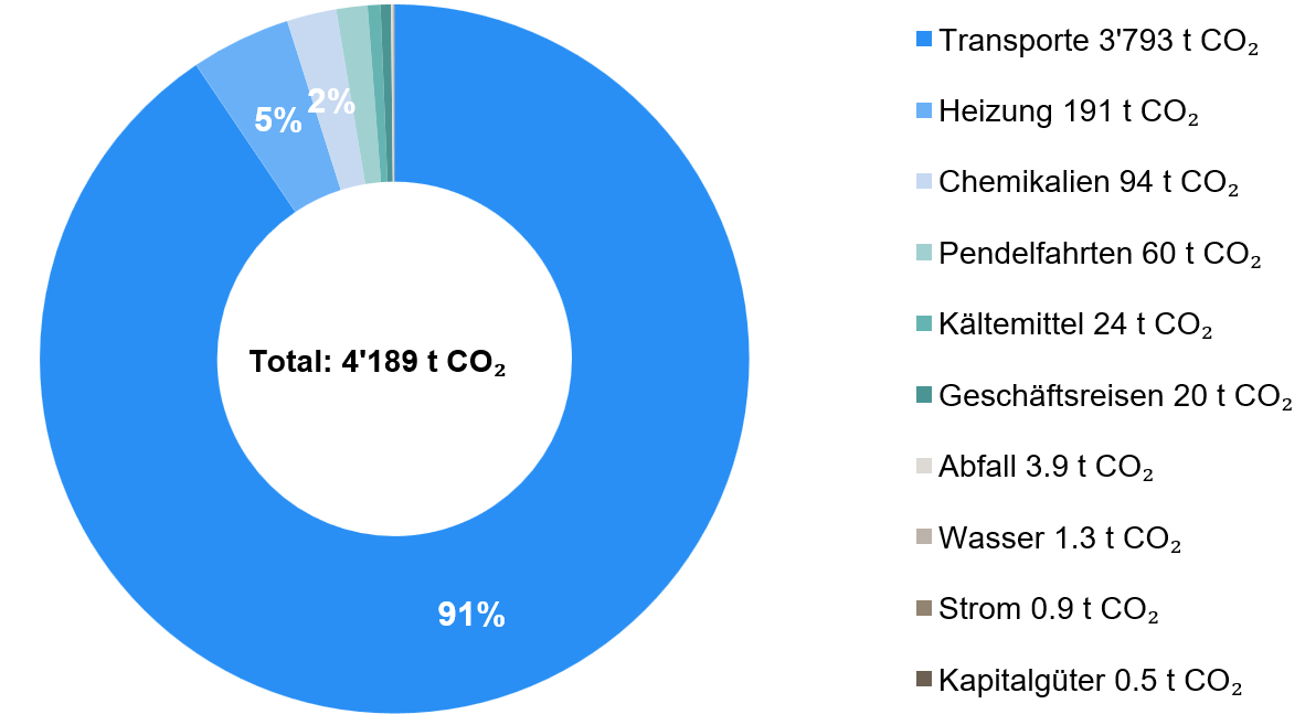 Für das Bilanzjahr 2024 belaufen sich die bilanzierten Emissionen auf 4’189 t CO2[1]. Die grössten Emissionsquellen sind dabei die Transporte, die Heizung und Chemikalien. Diese machen gemeinsam rund 98 Prozent der Bilanz aus.