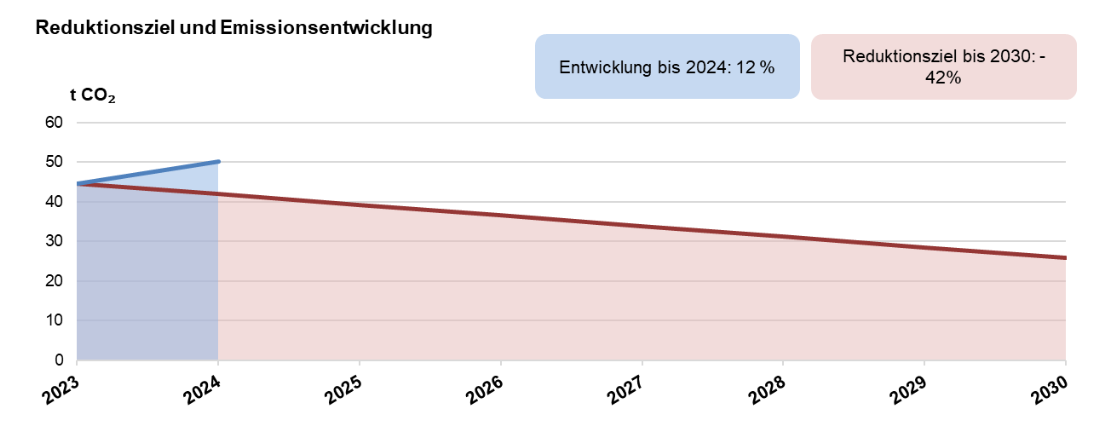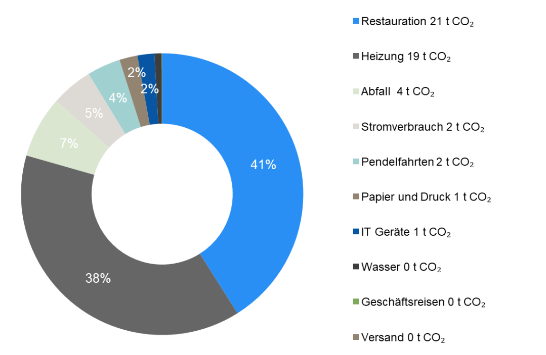 Für das Bilanzjahr 2024 belaufen sich die bilanzierten Emissionen auf 51 t CO21. Die grössten Emissionsquellen sind dabei die Restauration, die Heizung und Abfall. Diese machen gemeinsam rund 85 Prozent der Bilanz aus.