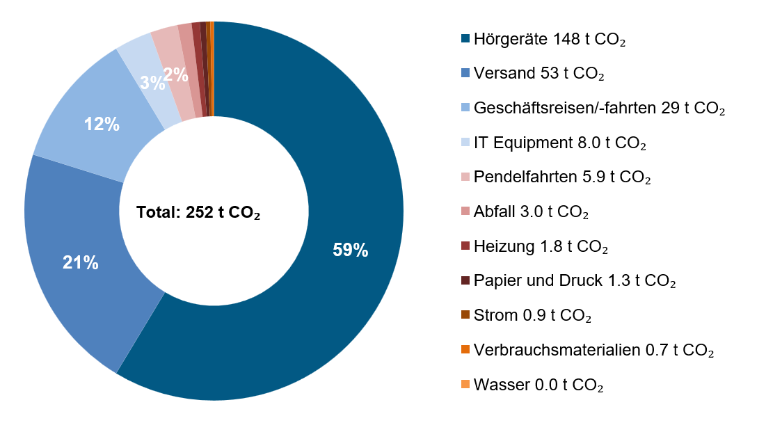 Für das Bilanzjahr 2023/24 (Oktober 2023-September 2024) belaufen sich die bilanzierten Emissionen auf 252 t CO21. Die grössten Emissionsquellen sind dabei die eingekauften Hörgeräte, der Versand der Hörgeräte und Geschäftsreisen/-fahrten. Diese machen gemeinsam rund 92 Prozent der Bilanz aus.