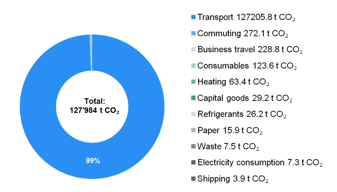 For the 2024 financial year, the reported emissions amount to 127’984 tons of CO₂. The main sources of emissions are transport, commuting and business travel.