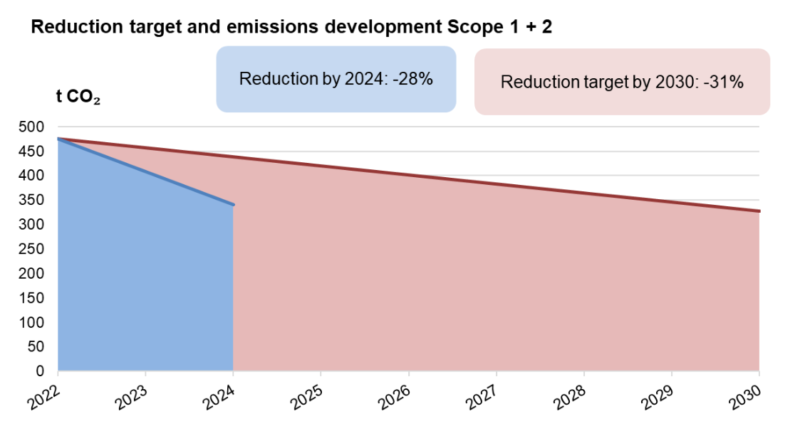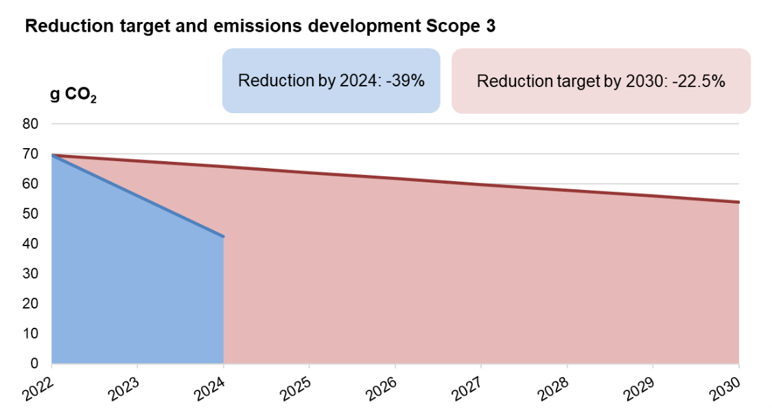 The climate strategy sets an absolute reduction target of -31% for Scope 1 & 2 by 2030, which corresponds to a saving of -149 tons of CO₂. For Scope 3, a relative reduction target of -22.5% per ton-kilometers (tkm) has been set. This means that CO₂ intensity is to be reduced from 70 g CO₂ per tkm in 2022 to 55 g CO₂ by 2030.
