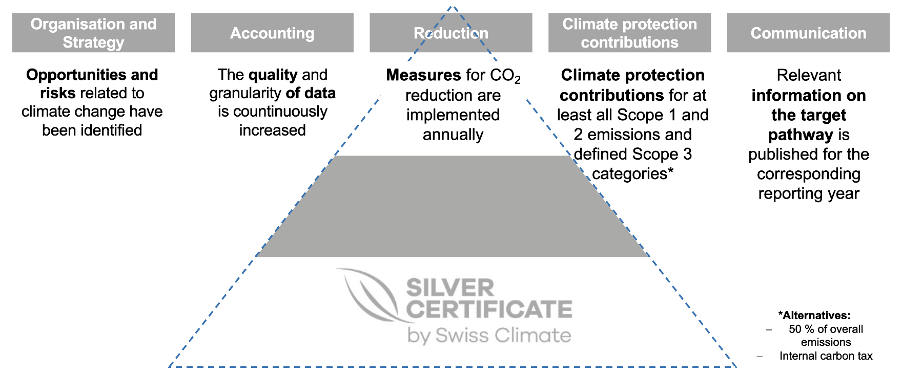 The label is awarded to companies that have established a holistic CO₂ management system covering the areas of organisation & strategy, accounting, reduction, climate protection contributions and communication. Compliance with the guidelines (version 10.1) is also audited annually by an external auditing company (Neosys AG or SGS).