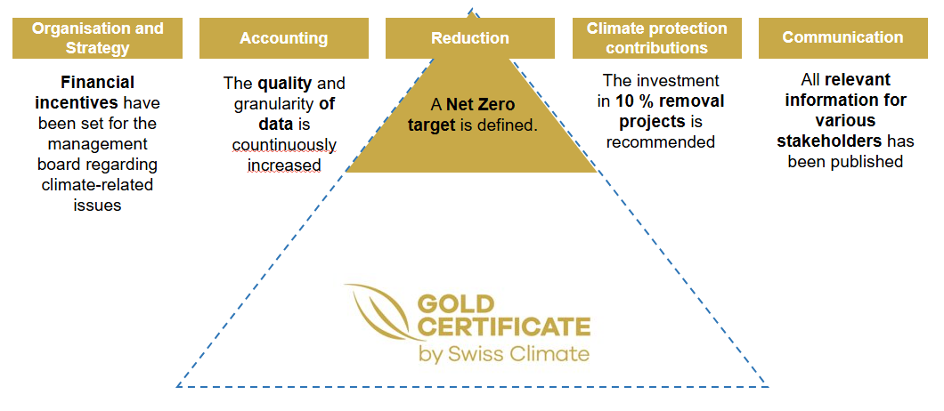 The label is awarded to companies that have established a holistic CO2 management system covering the areas of organisation & strategy, accounting, reduction, climate protection contributions and communication. Compliance with the guidelines (version 10.1) is also audited annually by an external auditing company (Neosys AG or SGS).