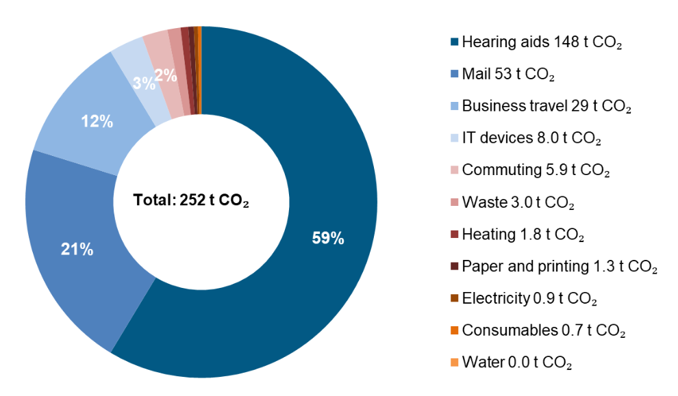 For the 2023/24 footprint year (October 2023 - September 2024), the emissions reported amount to 252 t CO₂1 . The largest sources of emissions are purchased hearing aids, the shipping of hearing aids and business travel/journeys. Together, these account for around 92 % of the CO2 emissions.