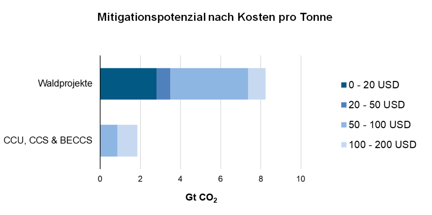 Par rapport aux technologies à émissions négatives, les projets forestiers sont souvent moins coûteux et plus rapides à mettre en œuvre. Ils permettent de réduire les émissions de CO₂ d'environ 8,25 Gt par an, dont 2,81 Gt pour 20 USD ou moins. Les technologies CCU, CCS ou BECCS peuvent séquestrer environ 1,85 Gt de CO₂ par an, dont 1 Gt coûte 100 USD ou plus.