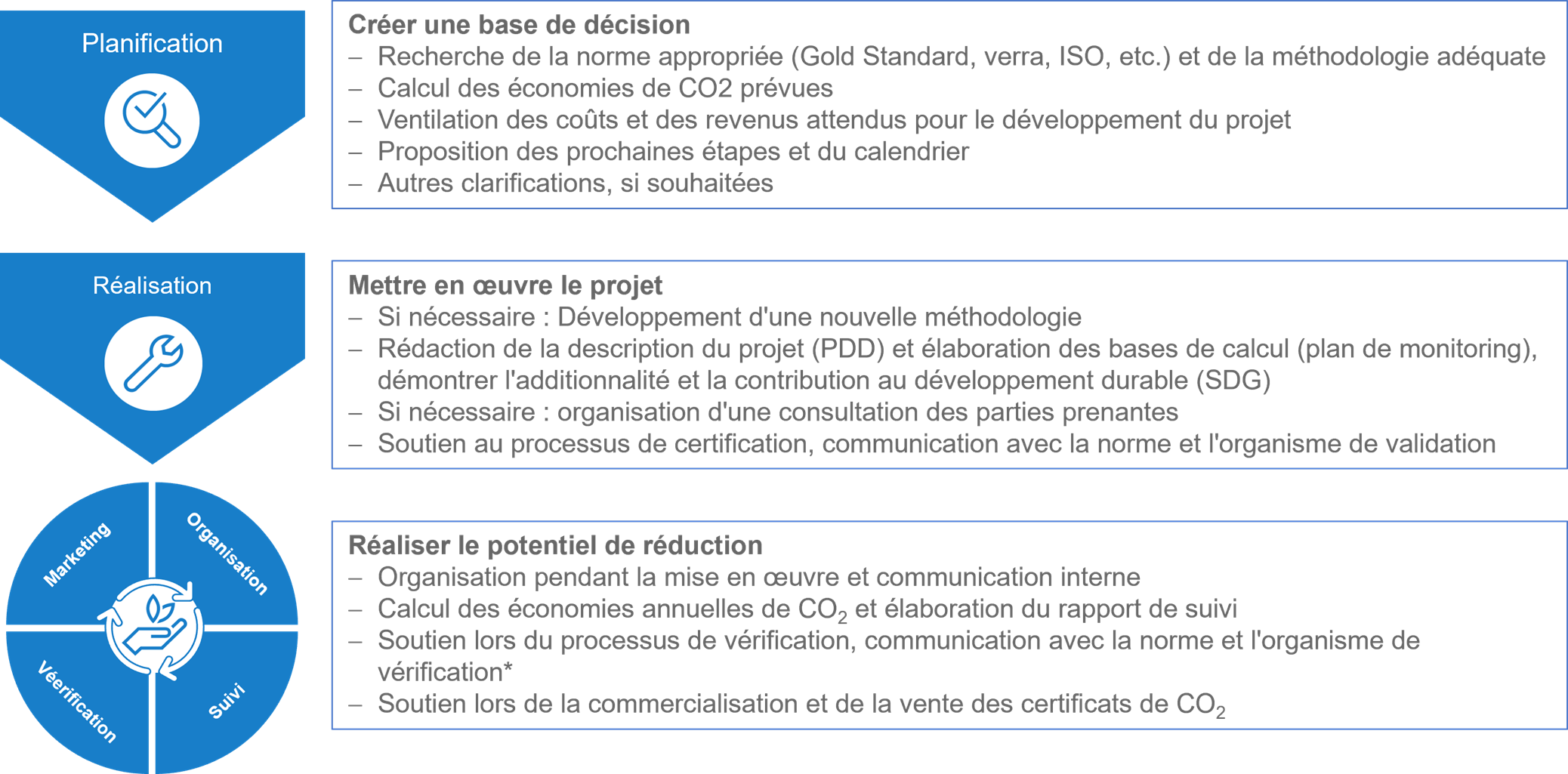 Les projets de protection climatique permettent soit d'éviter l'émission de gaz à effet de serre (prévention), soit de les extraire de l'atmosphère et de les stocker durablement (suppression), par exemple en développant la production d'énergie renouvelable ou la reforestation. Pour garantir l'impact des projets de protection climatique, ceux-ci sont développés selon des méthodologies établies au niveau international et selon les modalités de standards et de normes spécifiques, puis validés par des organismes de contrôle externes. Des certificats de CO2 sont délivrés pour les réductions d'émissions contrôlées et vérifiées chaque année, selon le projet.