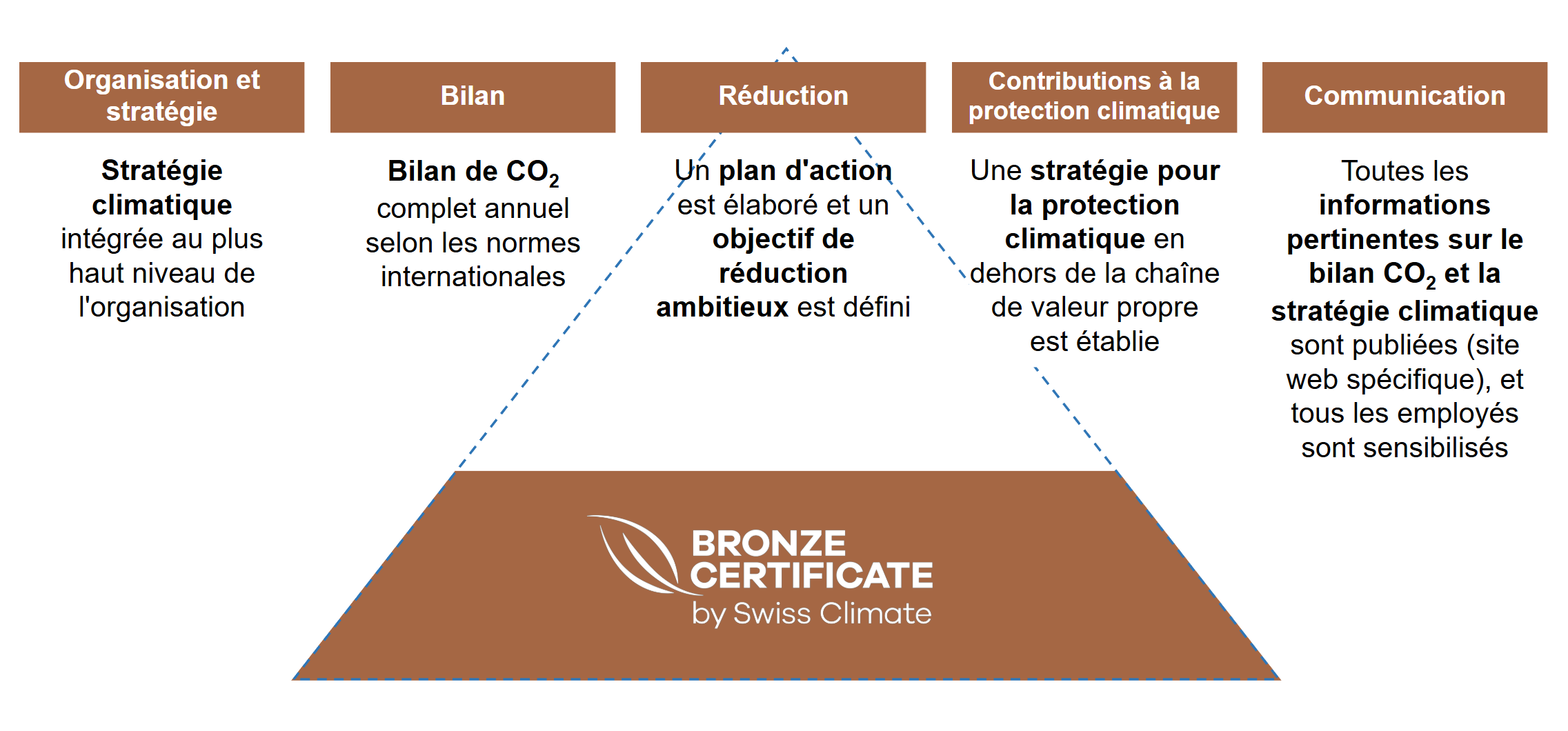 Ce label est décerné aux entreprises qui ont mis en place une gestion globale du CO₂ couvrant les domaines de l'organisation et de la stratégie, du bilan, de la réduction, des contributions à la protection du climat et de la communication. Le respect des directives (version 10.1) est en outre vérifié chaque année par un organisme de contrôle externe (Neosys AG ou SGS).